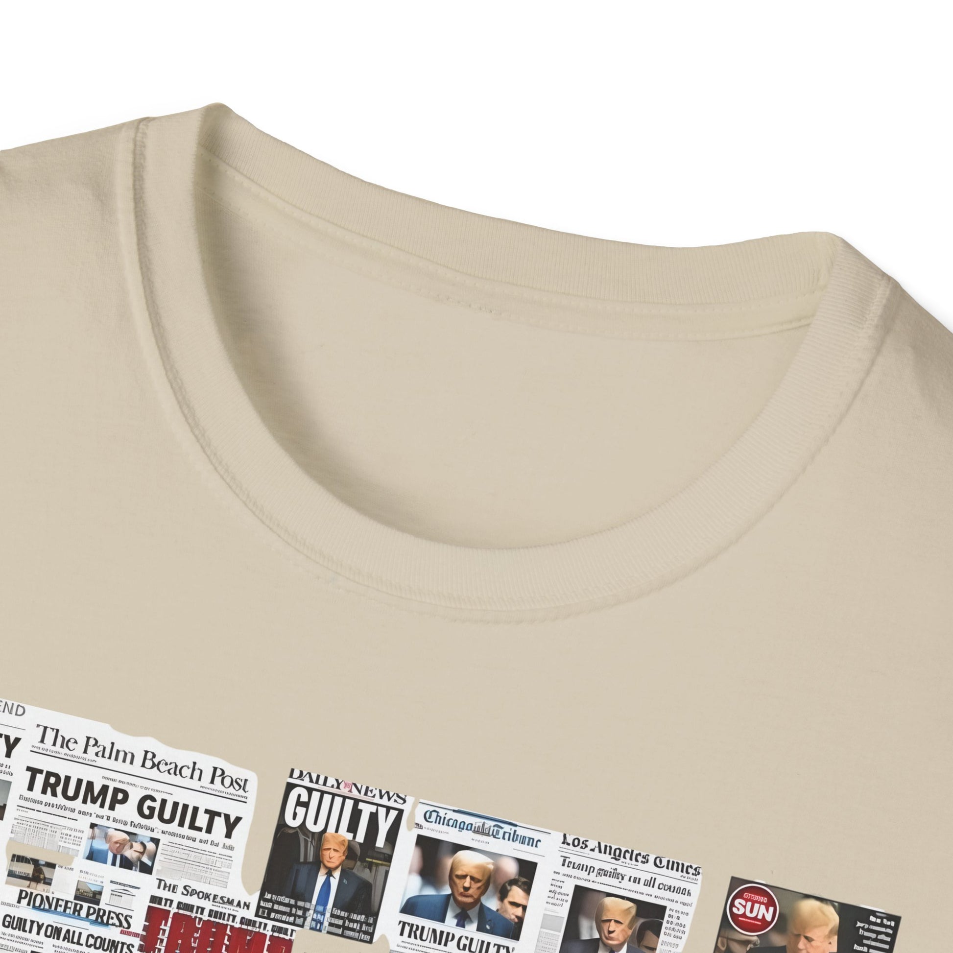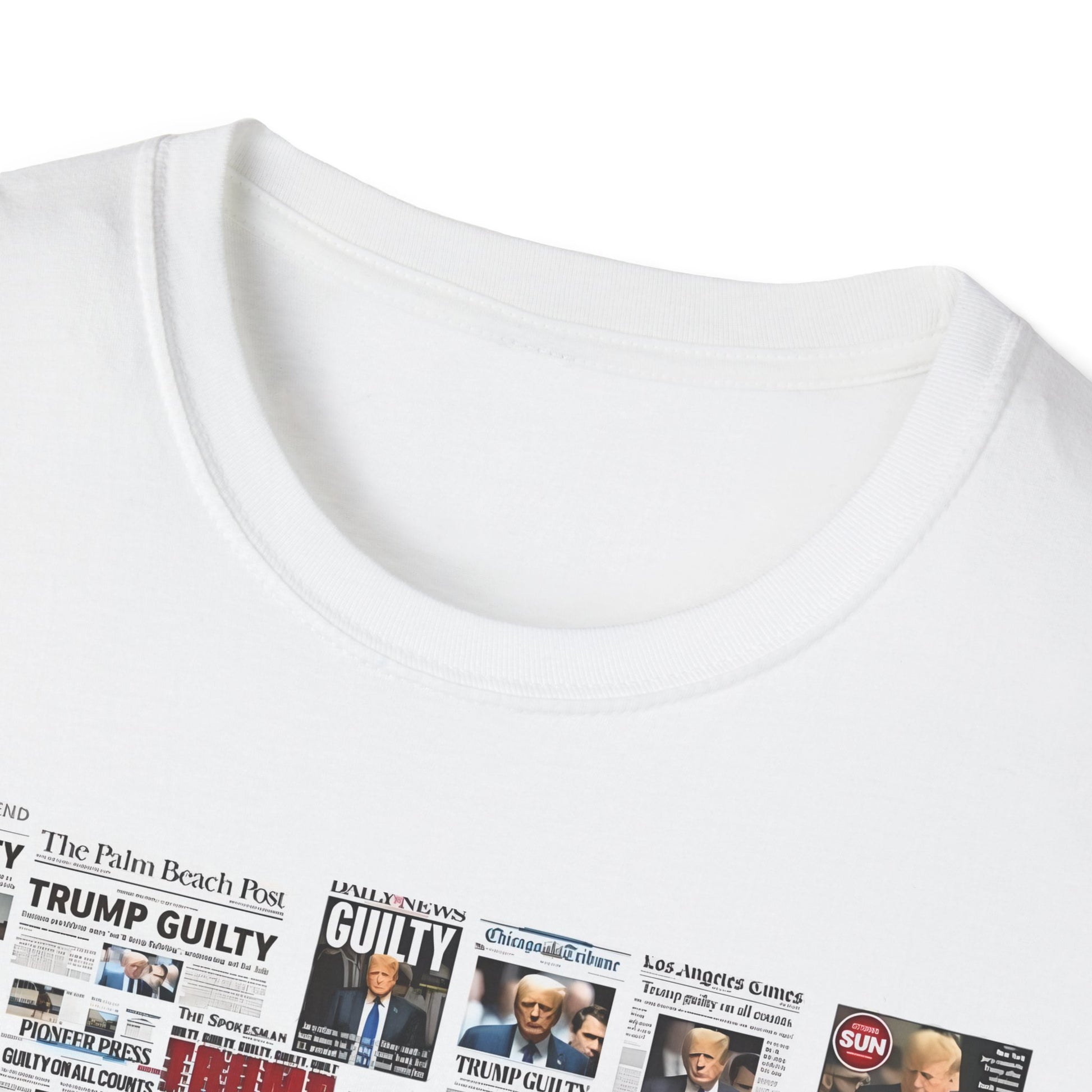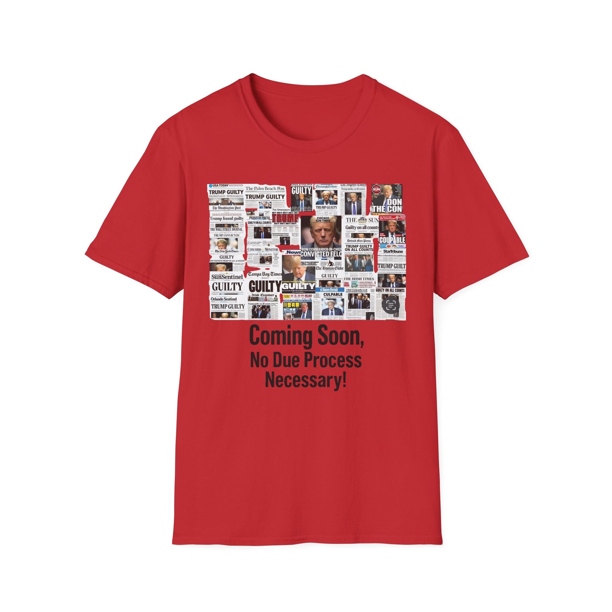 Make a powerful statement with this edgy and unapologetic t-shirt featuring the phrase "Coming Soon – No Due Process Necessary" boldly printed above a striking collage of newspaper clippings declaring Trump guilty. Whether you're protesting political corruption, expressing frustration with injustice, or simply making your stance clear, this shirt pulls no punches.
