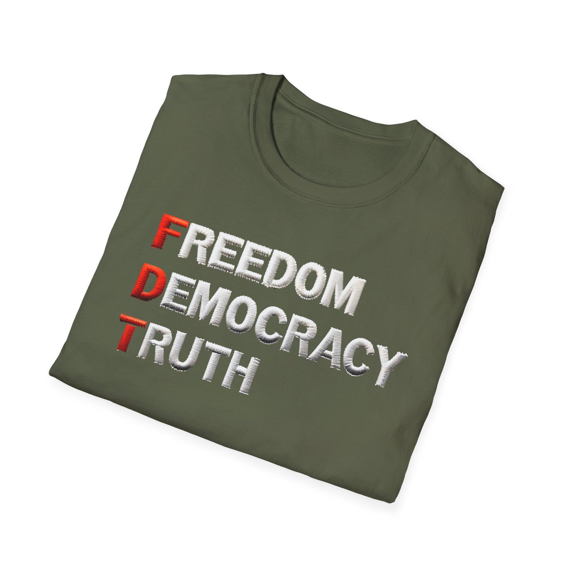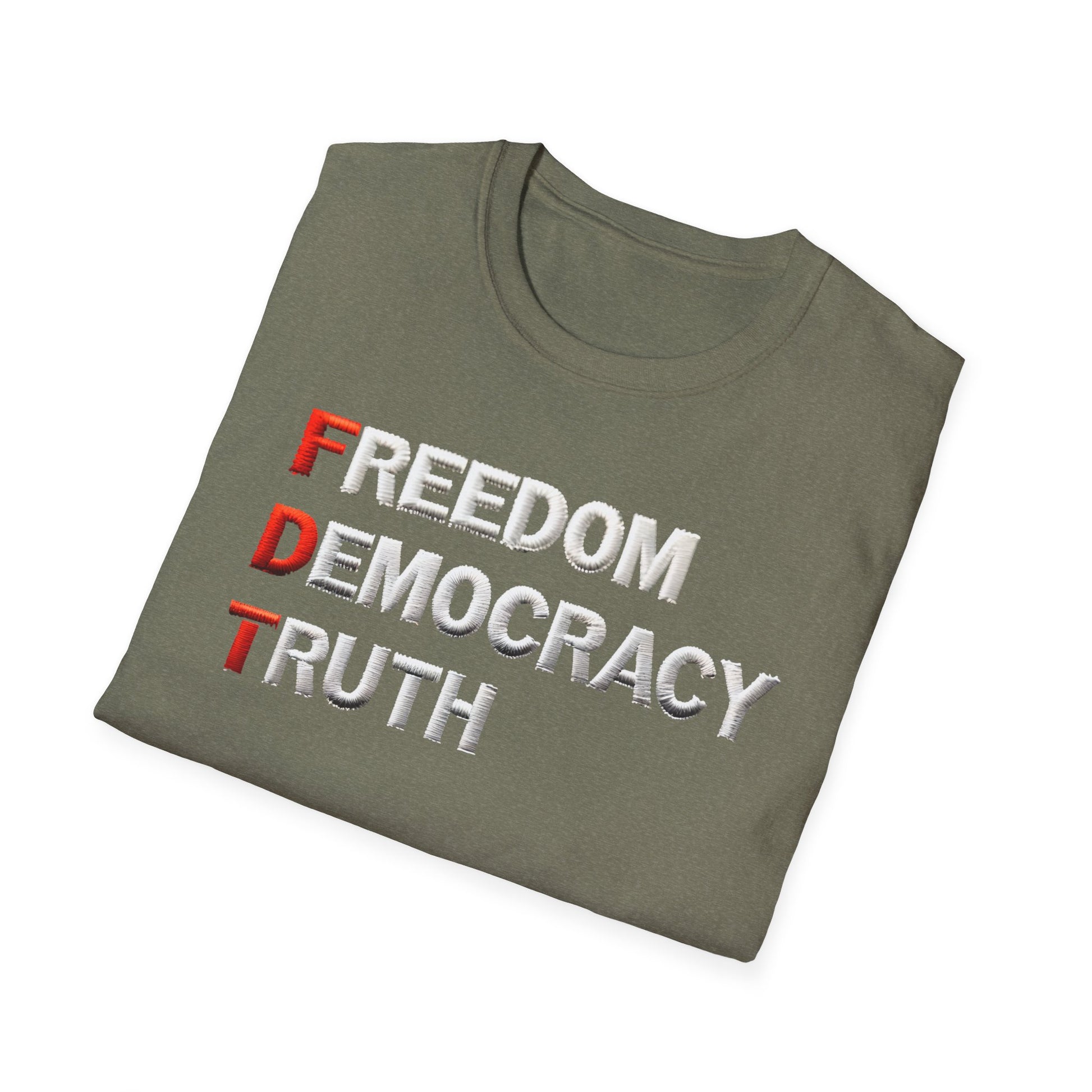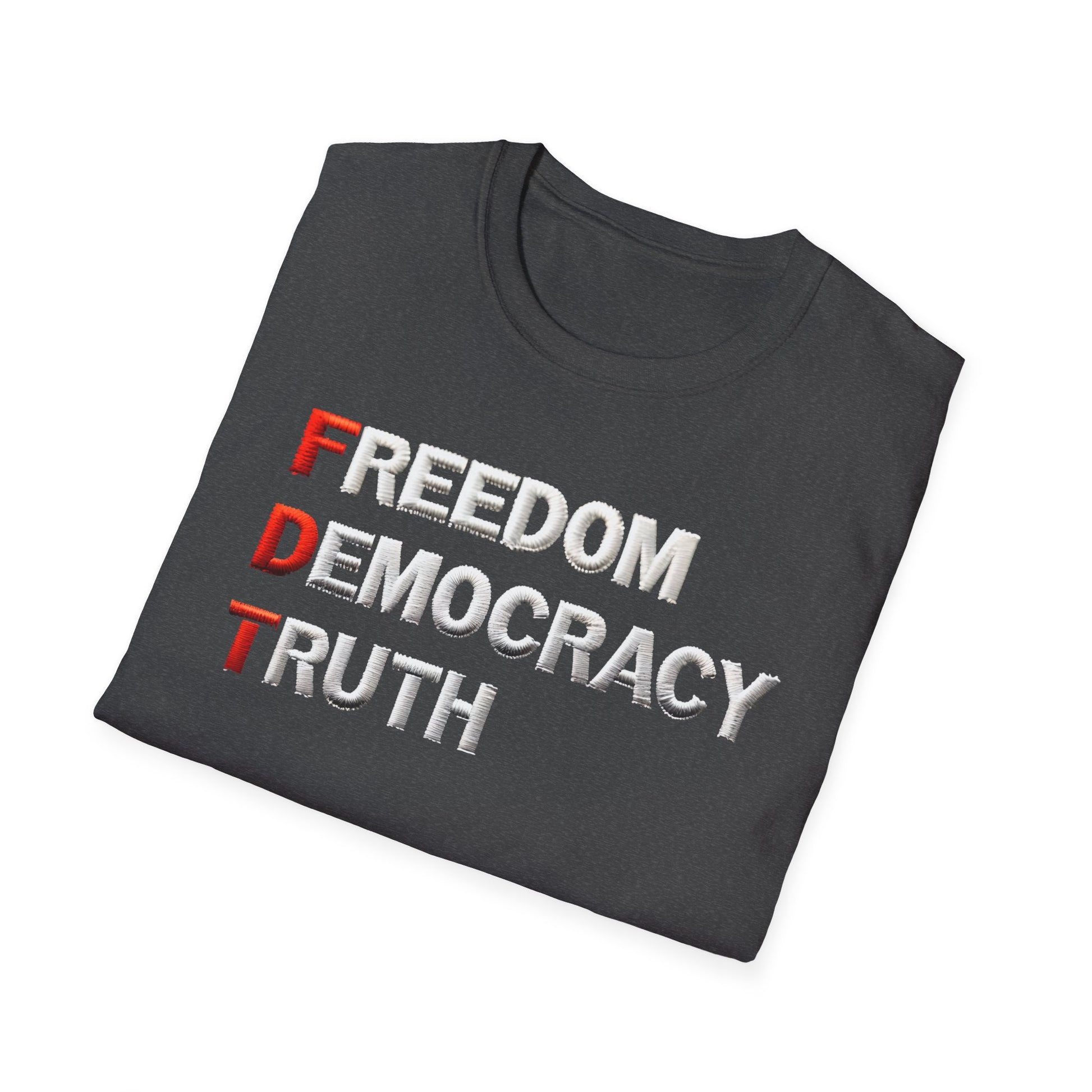 Make a powerful statement with our Freedom Democracy Truth (FDT) unisex t-shirt. Designed for those who believe in the core values that define a true democracy, this tee highlights FDT in bold red letters—sending a message that speaks louder than words.