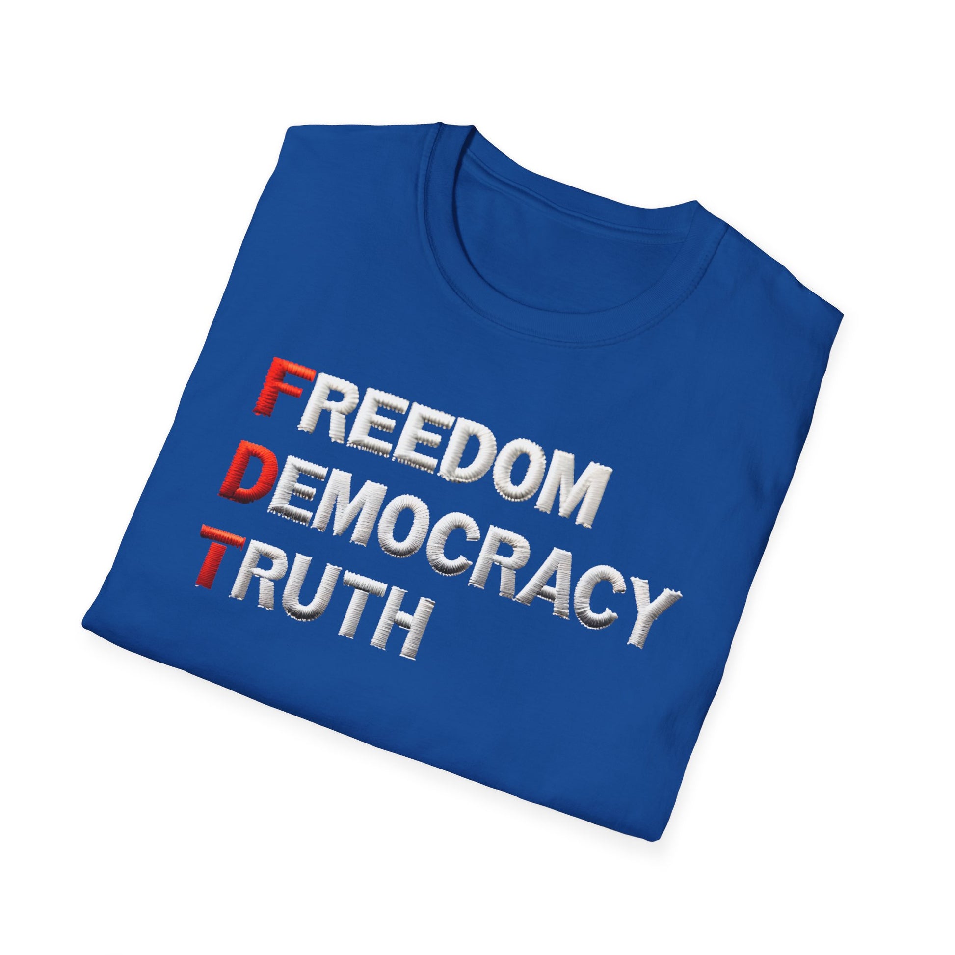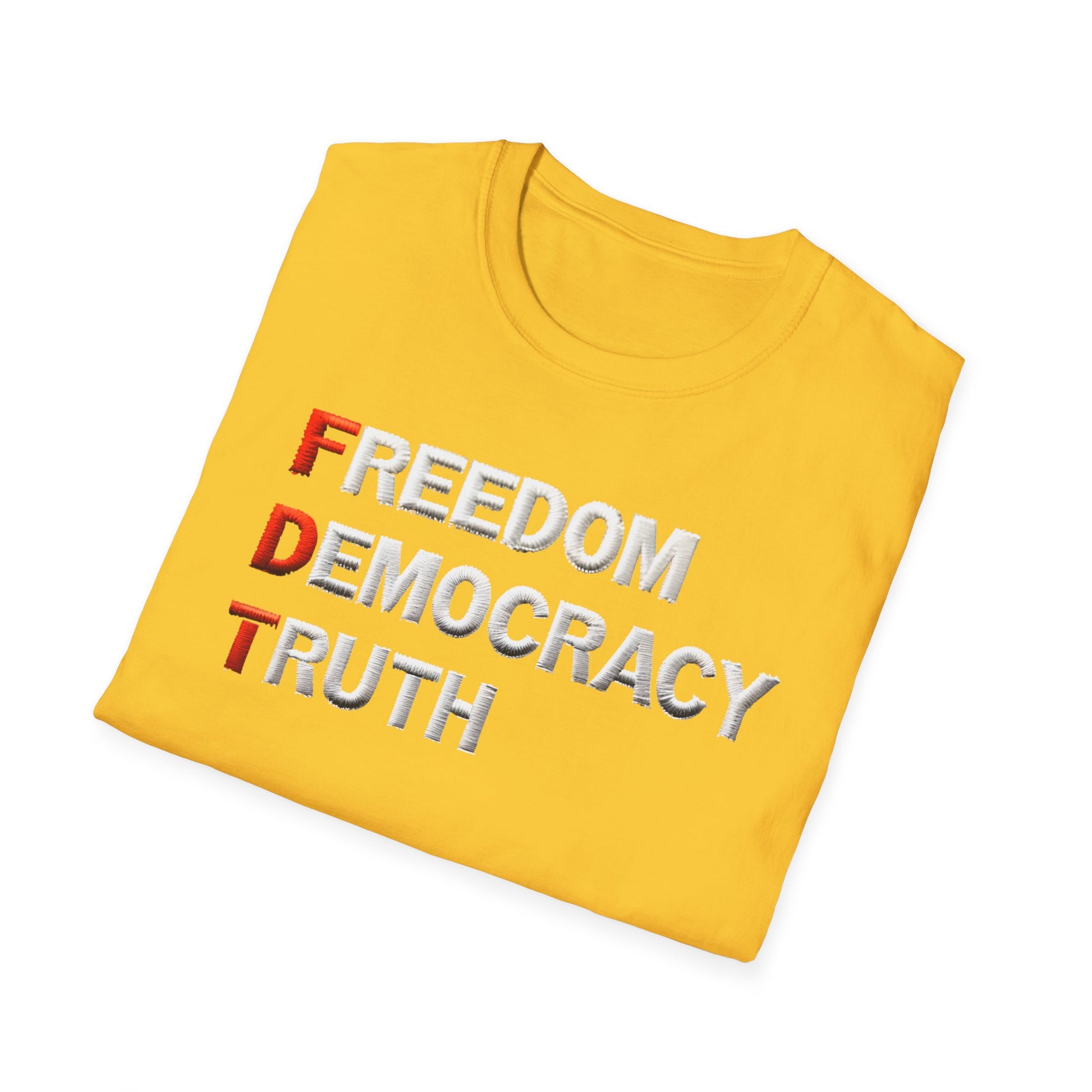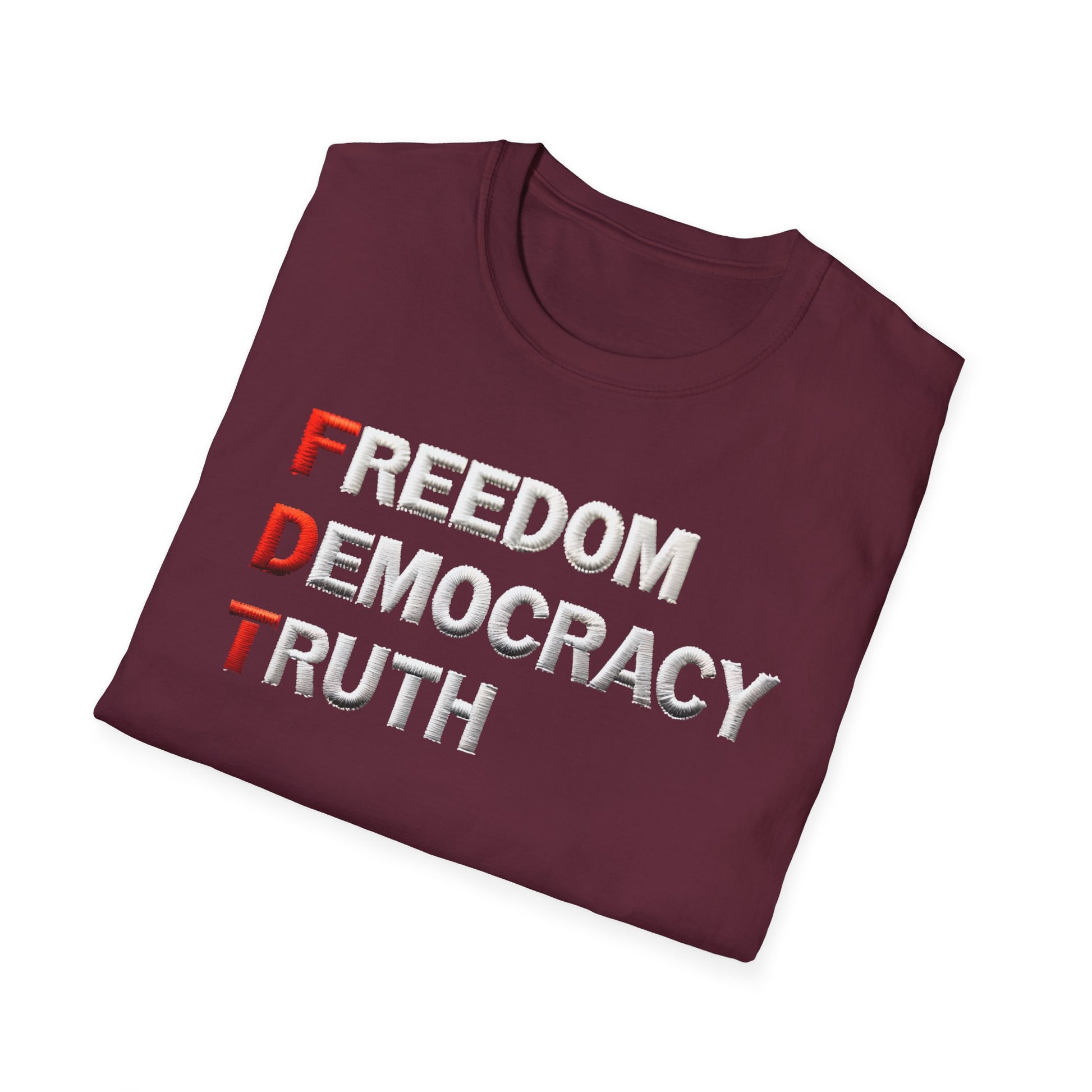 Make a powerful statement with our Freedom Democracy Truth (FDT) unisex t-shirt. Designed for those who believe in the core values that define a true democracy, this tee highlights FDT in bold red letters—sending a message that speaks louder than words.
