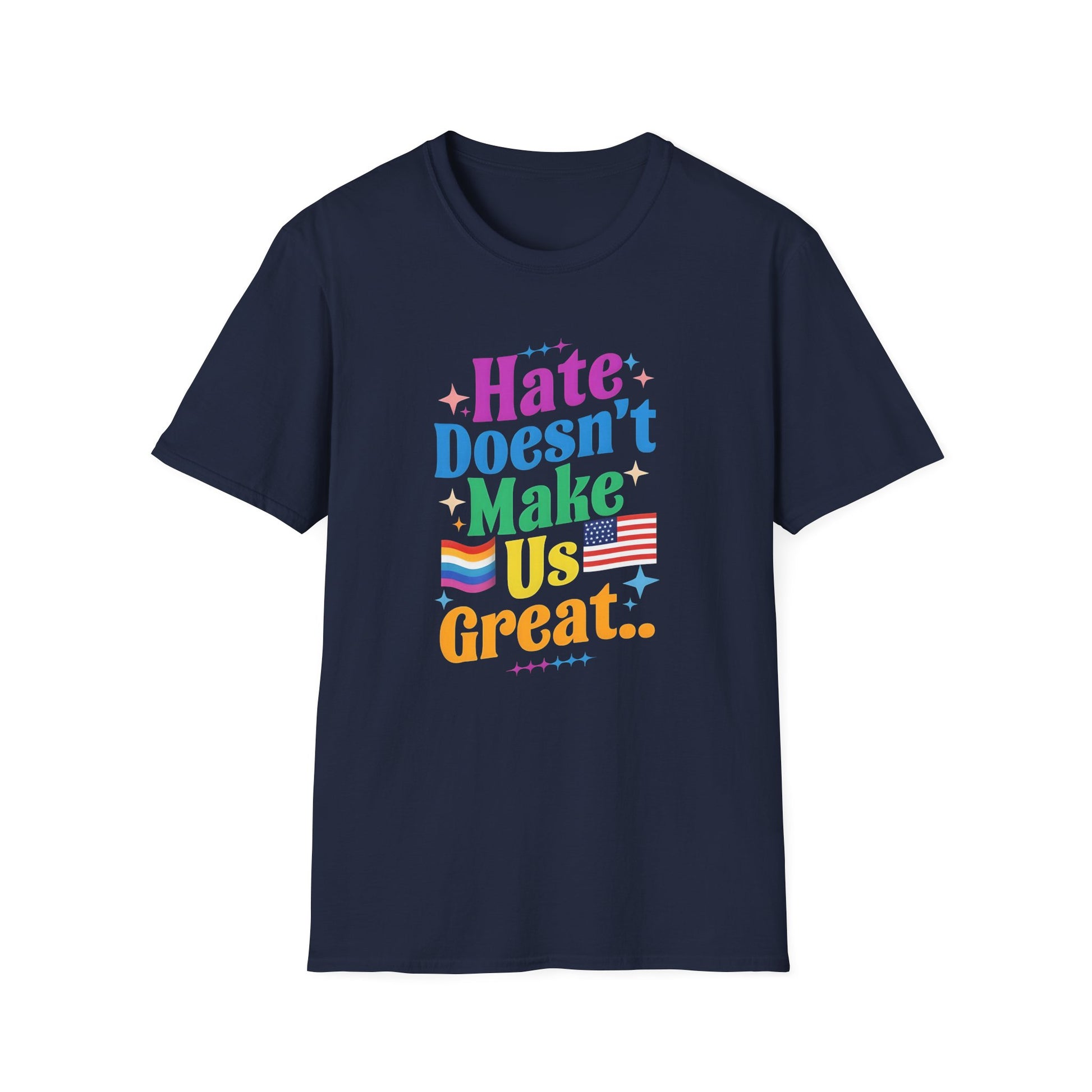 Hate Doesn't Make Us Great T-Shirt | Unisex Softstyle Tee, LGBTQ Pride, Equality, Love Wins, Rainbow Graphic Tee, Wearable Message