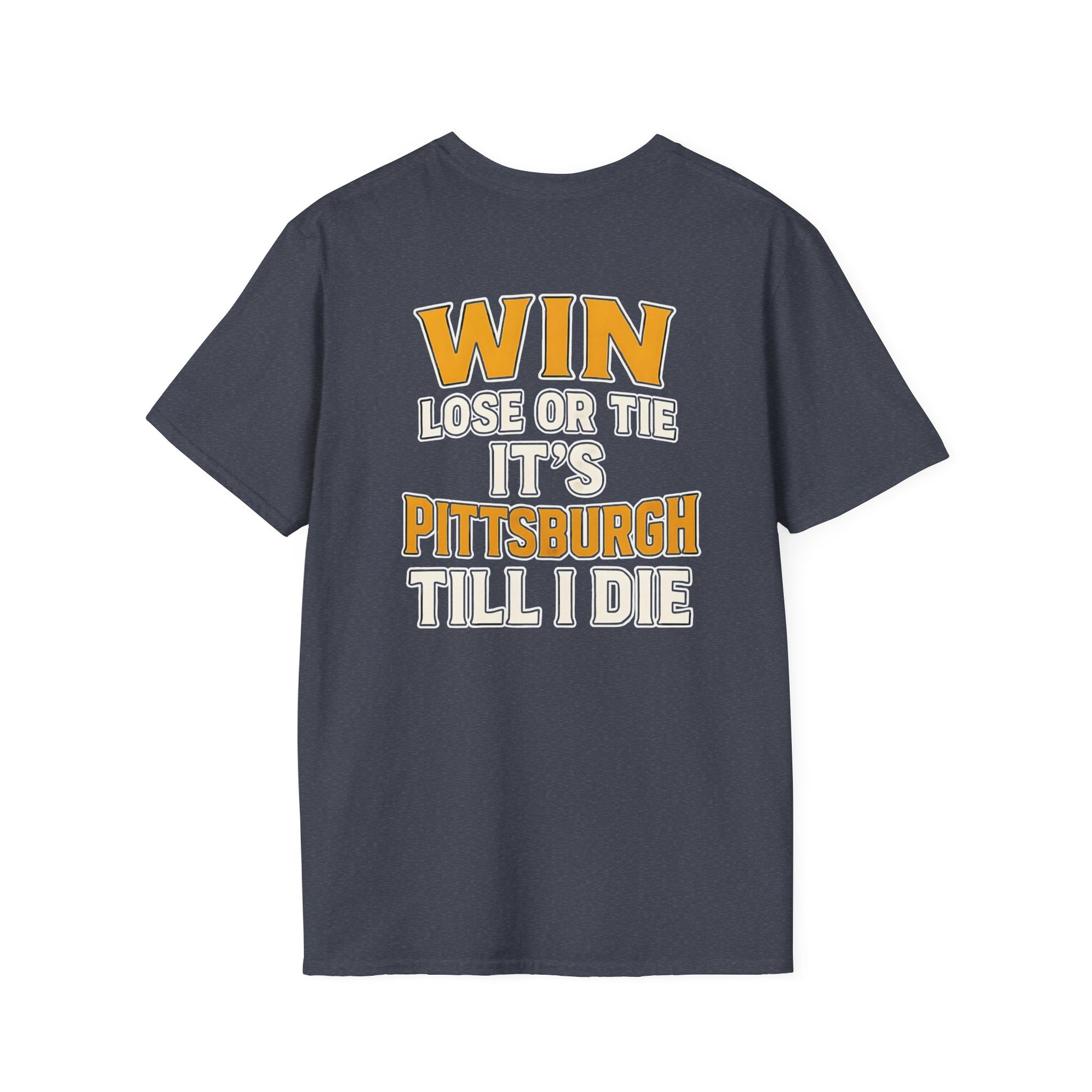 Rep your team from every angle with our “I Bleed Black and Yellow” / “Win, Lose, or Tie… Pittsburgh Till I Die” unisex tee. With bold graphics printed on both the front and back, this shirt is built for true Steelers fans who never stop showing their pride.
