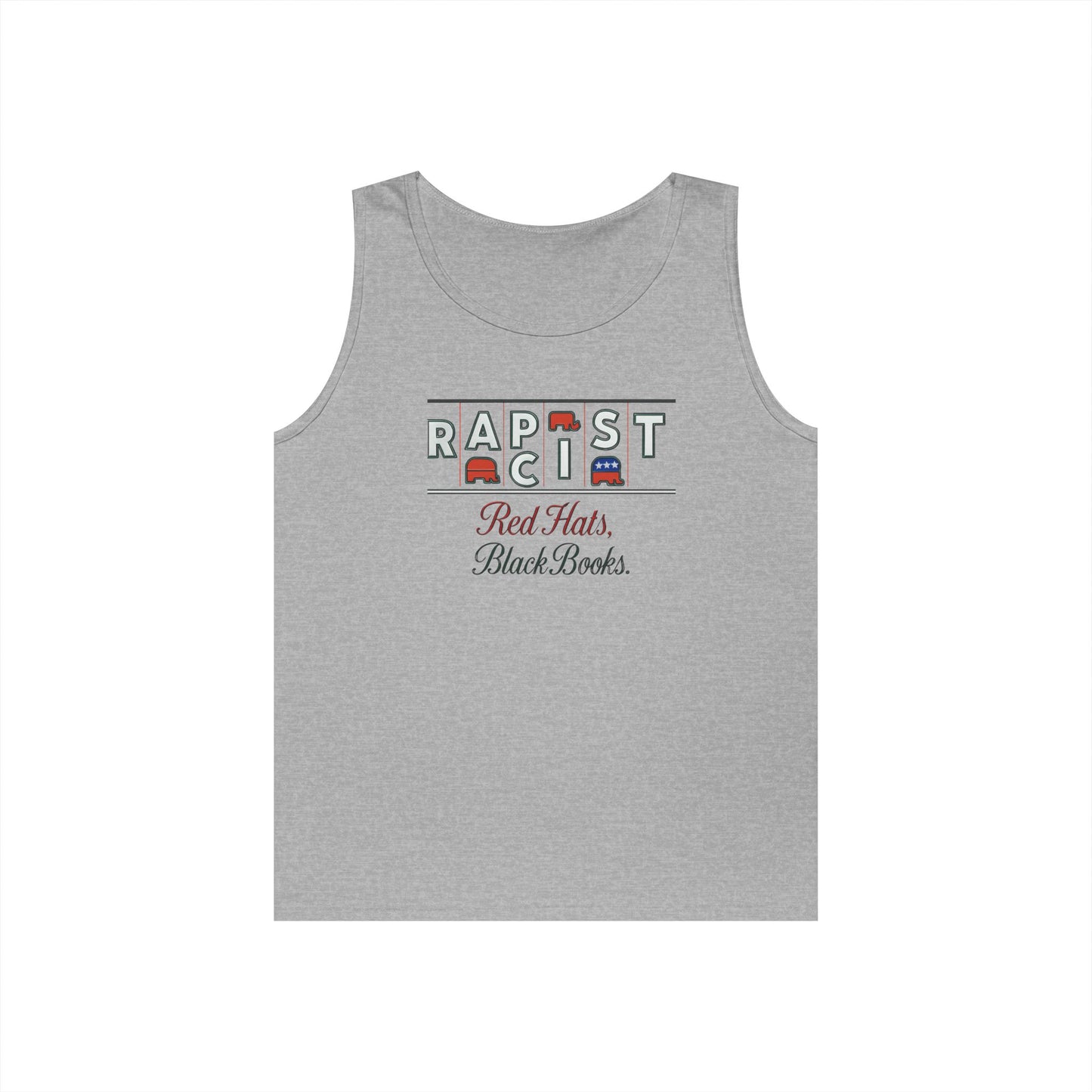 Red Hats, Black Books. Unisex Heavy Cotton Tank Top - Fun Summer Staple, Perfect for Festivals, Casual Wear, Gift for Book Lovers, Great for Hot Days
